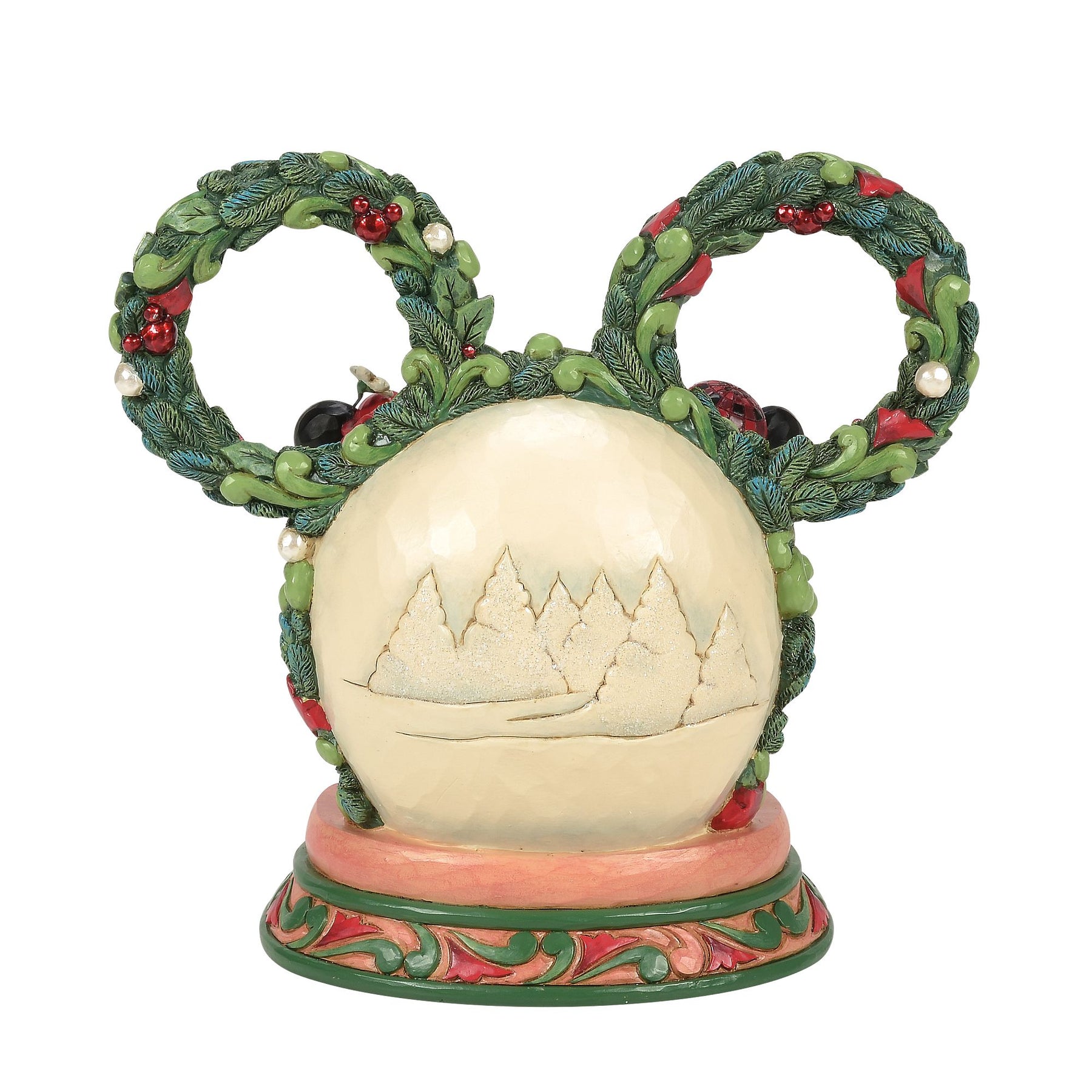 This delightful Jim Shore Christmas scene captures Mickey and Minnie holding hands beneath a glowing LED diorama, framed by a festive Mickey-shaped garland adorned with berries and pearl accents. It radiates seasonal magic with holiday charm.