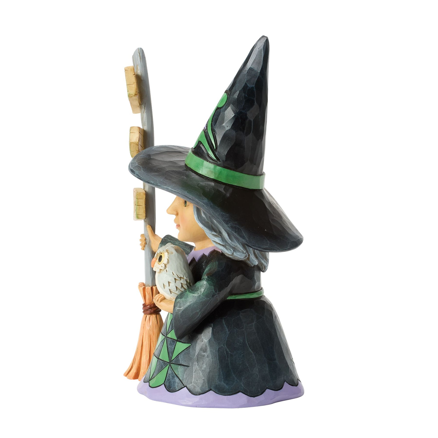Dressed in classic Halloween hues of purple, black, and green, this little Jim Shore witch holds an owl and a broomstick-shaped signpost. With playful arrows pointing to Witch Way and Scareville, she's ready to guide your way to Halloween fun!