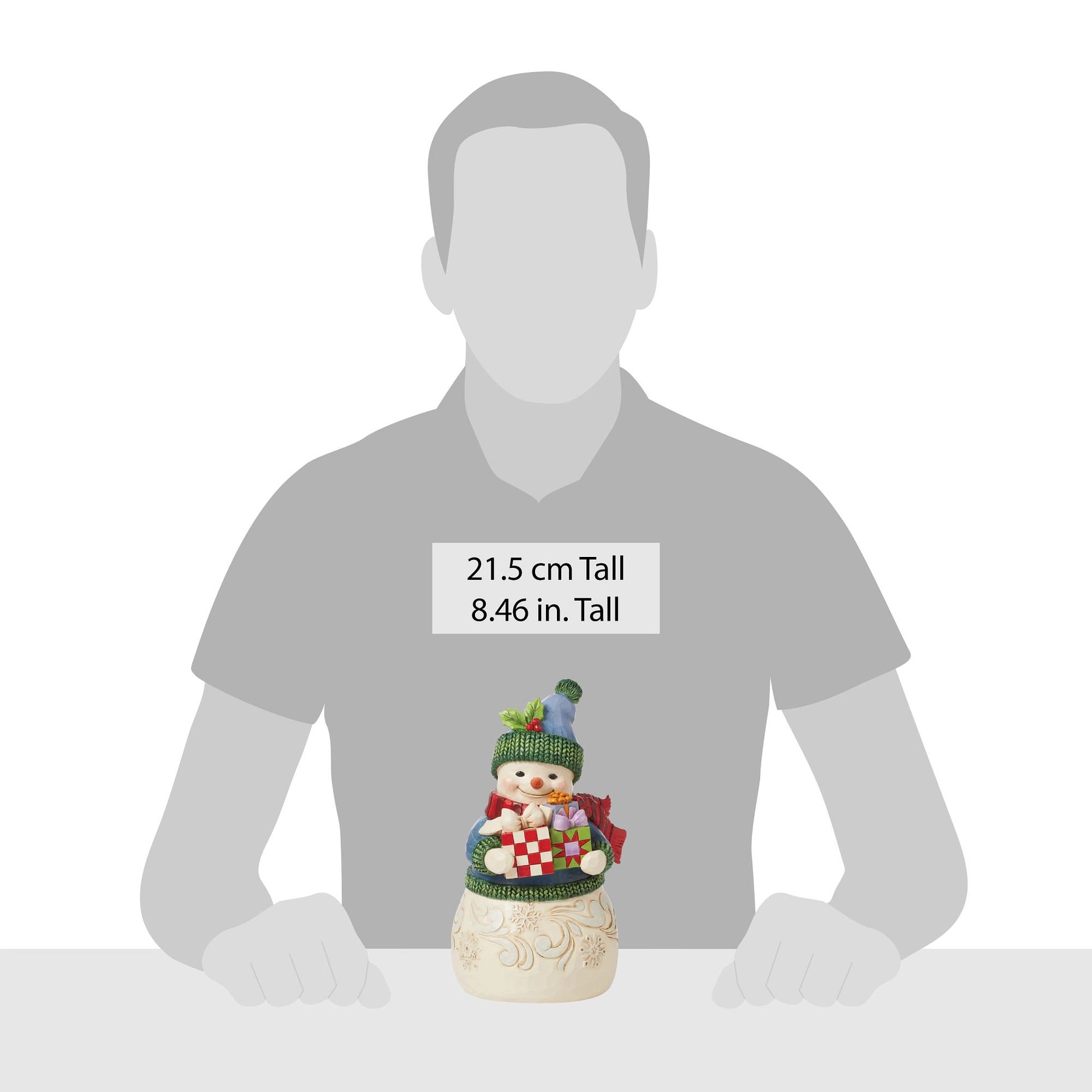 This charming snowman figurine by Jim Shore inspires holiday happiness. Keeping warm wearing a knitted sweater, holly trim hat, and billowing red scarf this snowman boasts rosy cheeks in the chilled air. He smiles with arms full.
