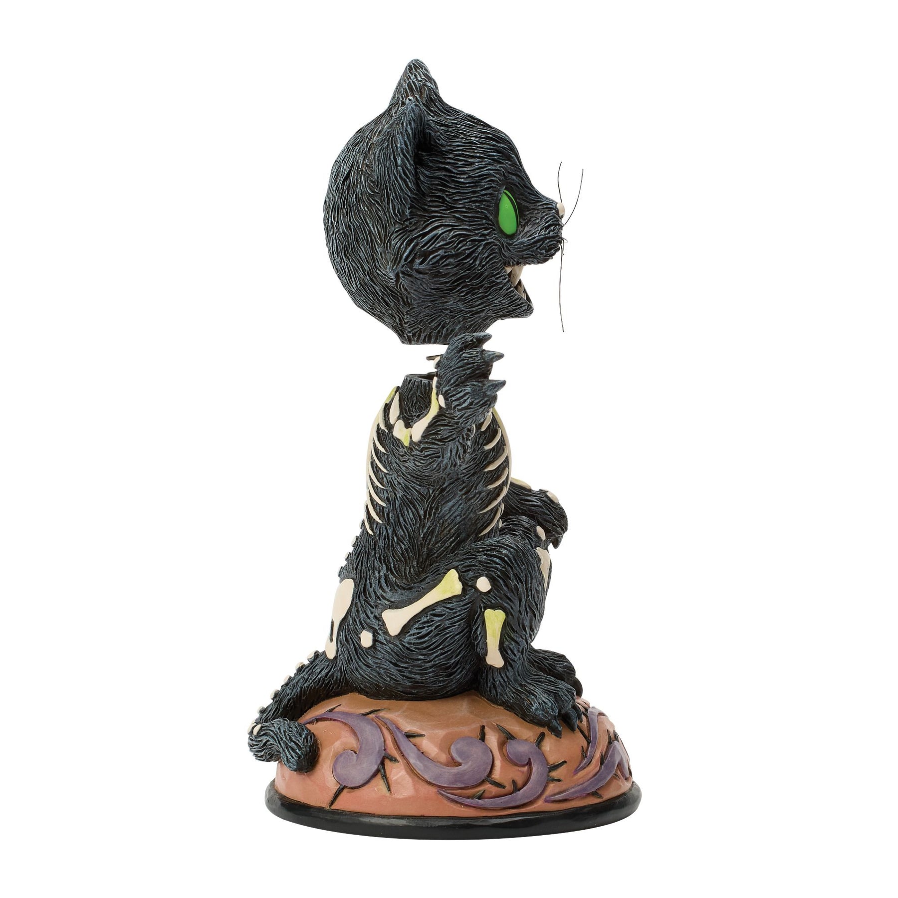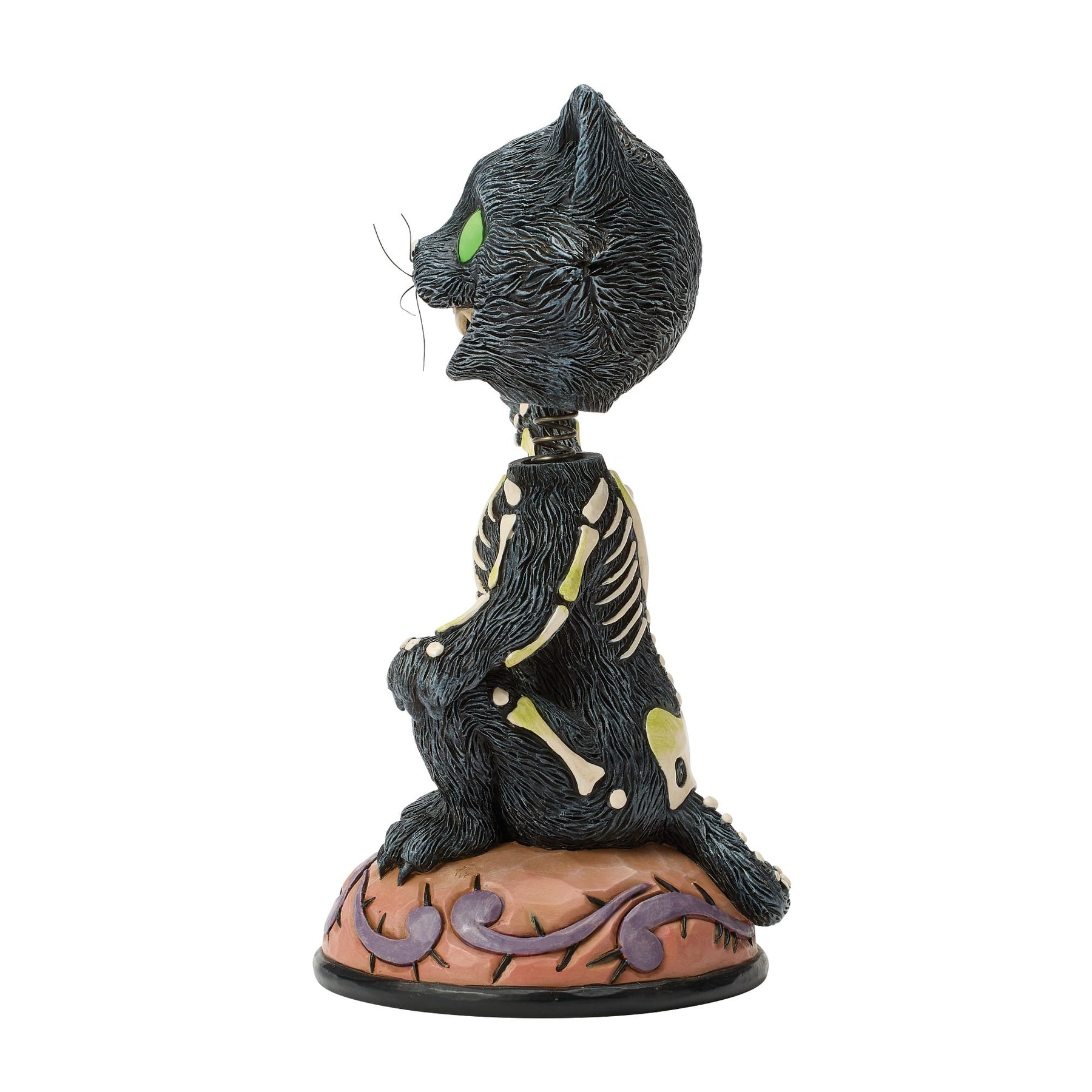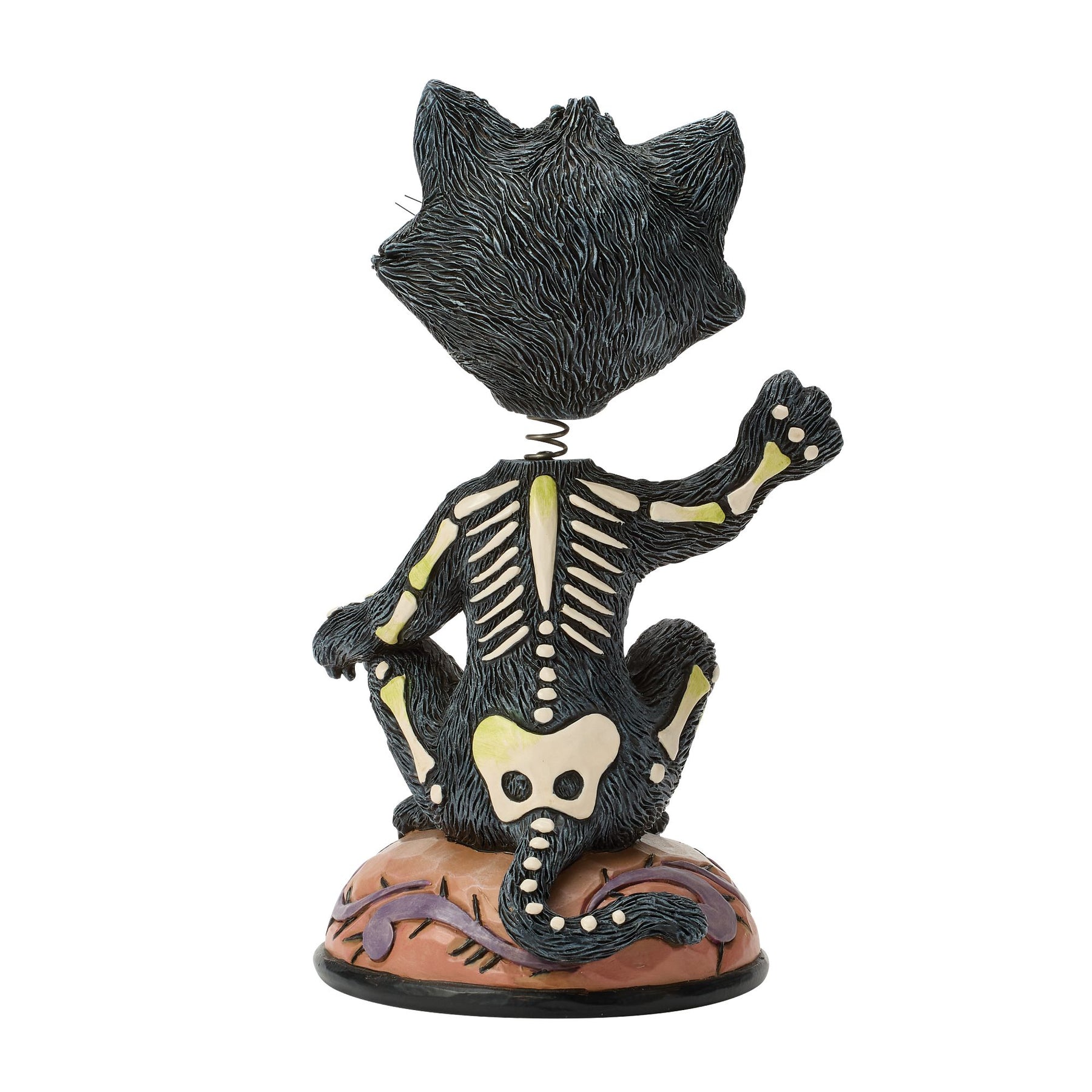 This spooky black cat from Jim Shore is all smiles as he waves a bony paw your way! With piercing green eyes and skeleton bones details etched into his fur, this eerie feline is a playful bobble head that adds frightful fun to your Halloween decor.