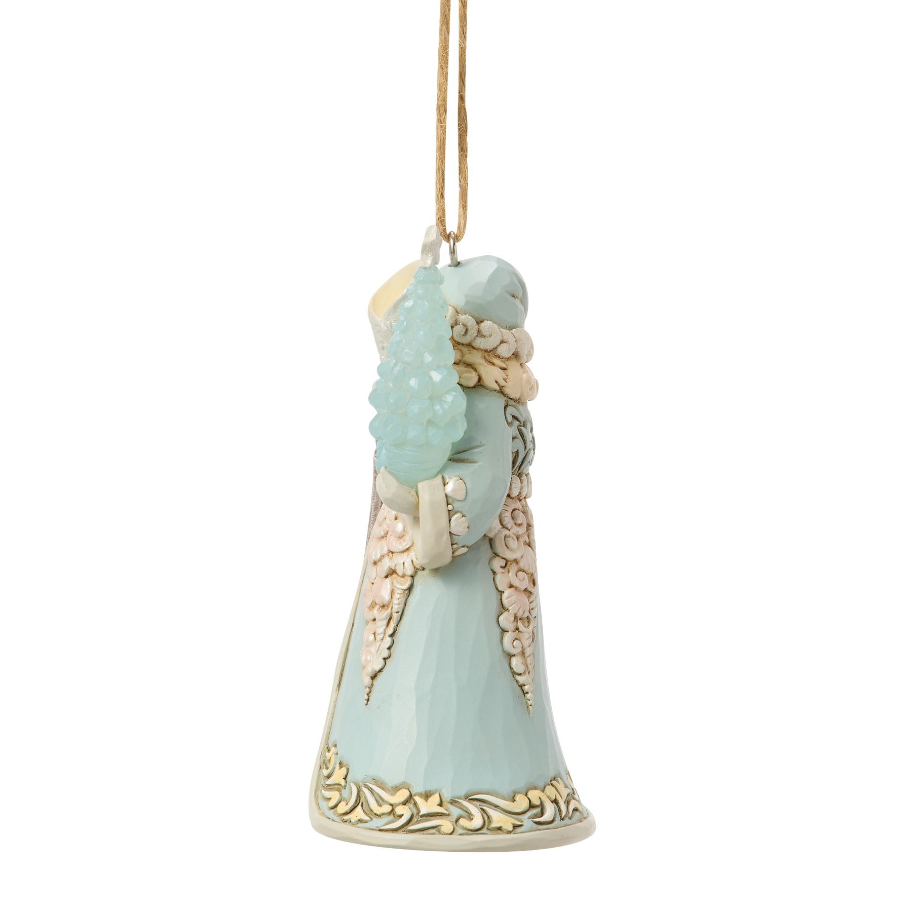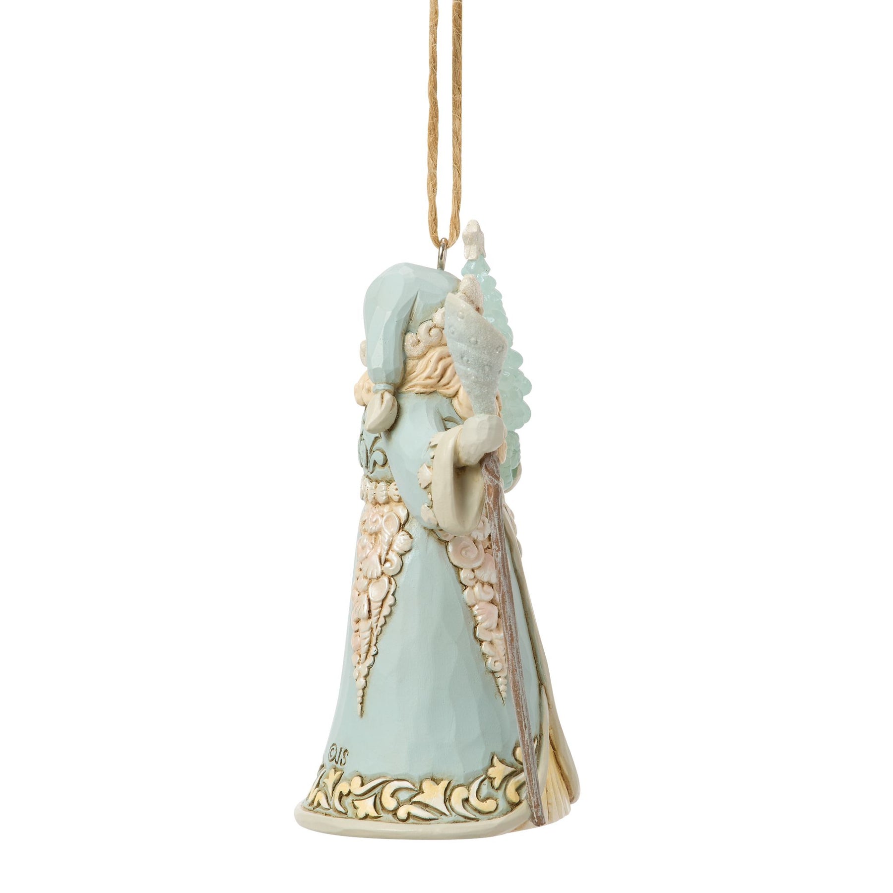 Dressed in coastal blue, this Heartwood Creek Santa ornament is completely adorned with treasures from the sea. Shells trim his hat, cloak, gown, and sleeves, with a shell belt at his waist. He carries a conch staff and a sea glass tree.