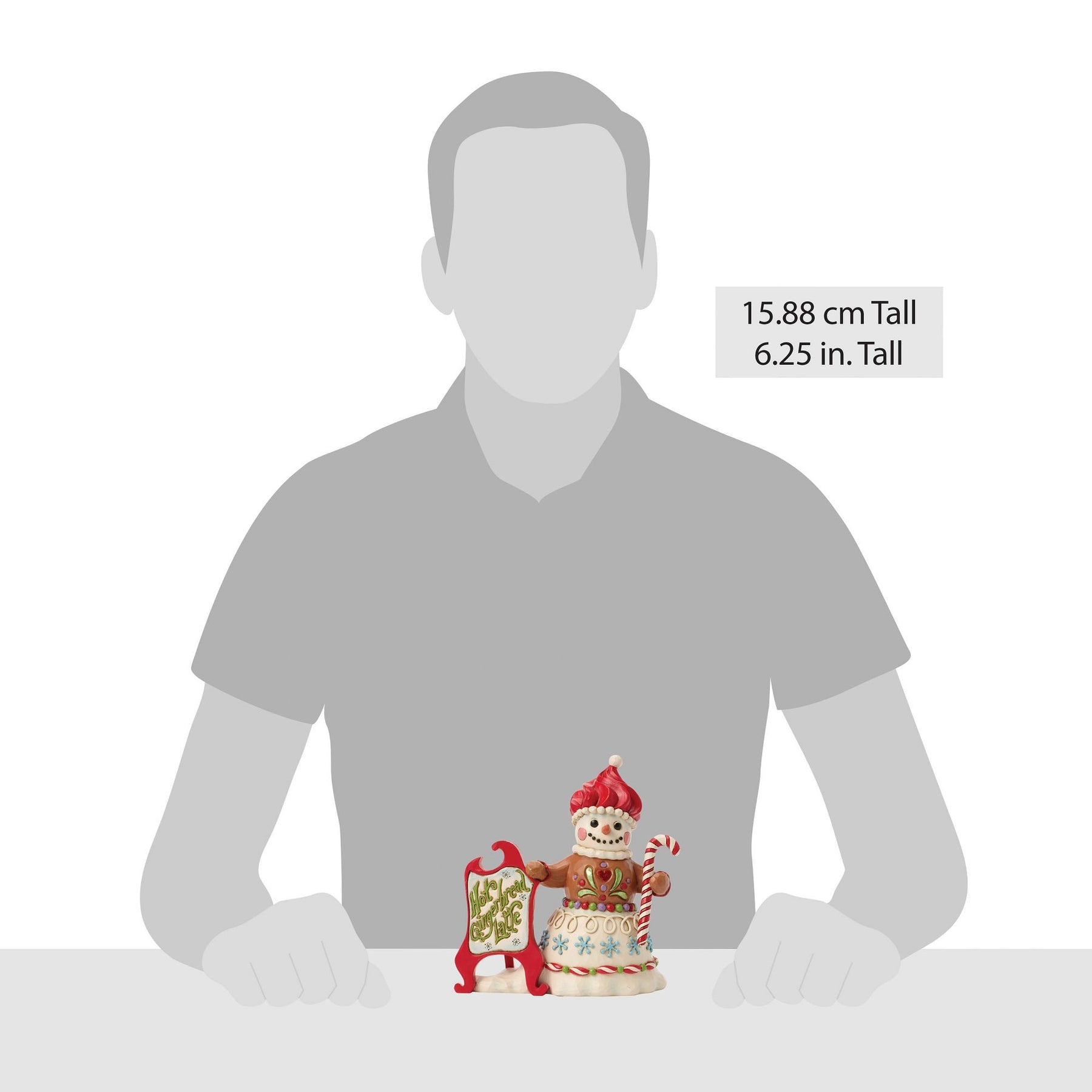 This sweet snowman holds a festive sign, inviting all to join in the holiday fun. Jim Shore's signature folk-art designs blend with candy-inspired accents, making it look almost good enough to eat. Add a whimsical touch with gingerbread-themed decor.